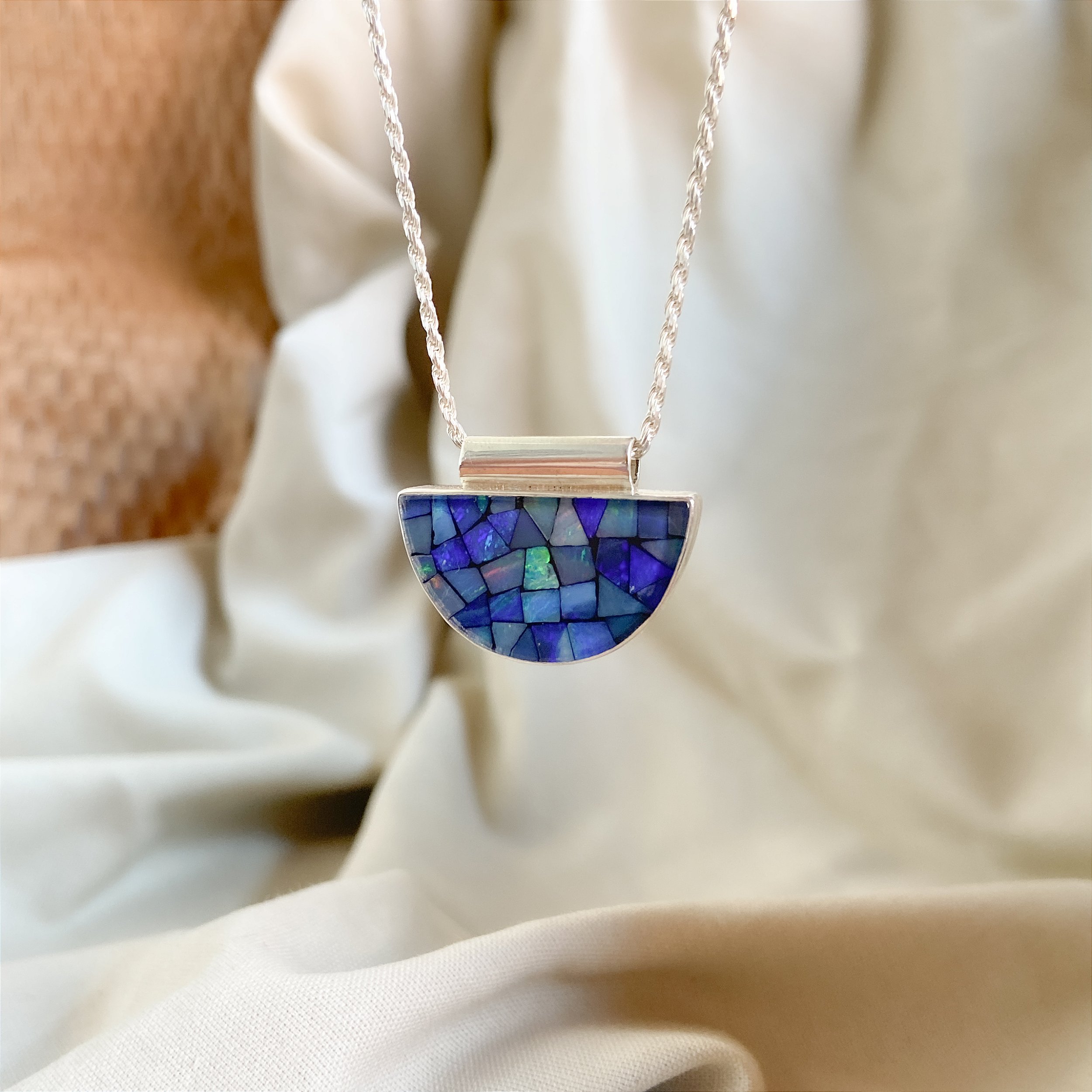 Pingente confeccionado artesanalmente com prata 950 e mosaico de opala.